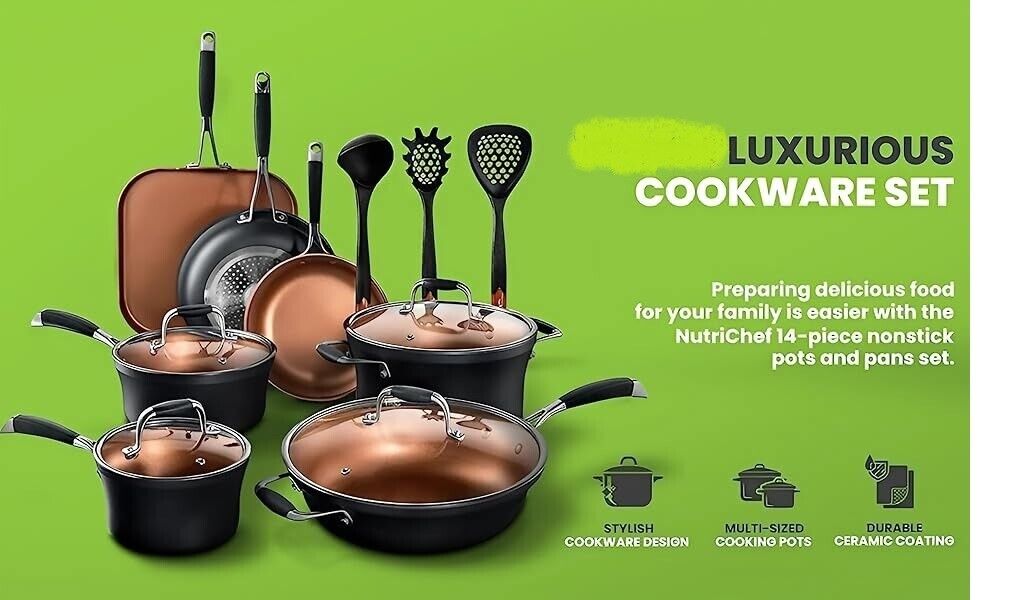 Get this amazing 14-pieces nonstick pot and pan set for your kitchen or as a luxurious housewarming present. Surprise your loved ones with a practical and elegant present that will help them set up an outstanding kitchen.